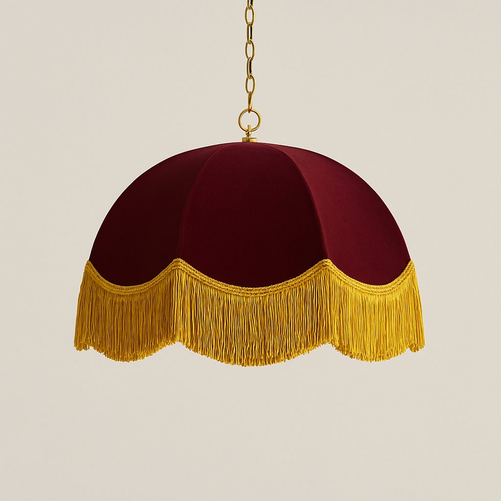 Lámpara colgante, fabricada a partir de una estructura metálica con recubrimiento electrostático en color negro. Forrada con una cubierta de tela color tinto y fleco en color dorado.