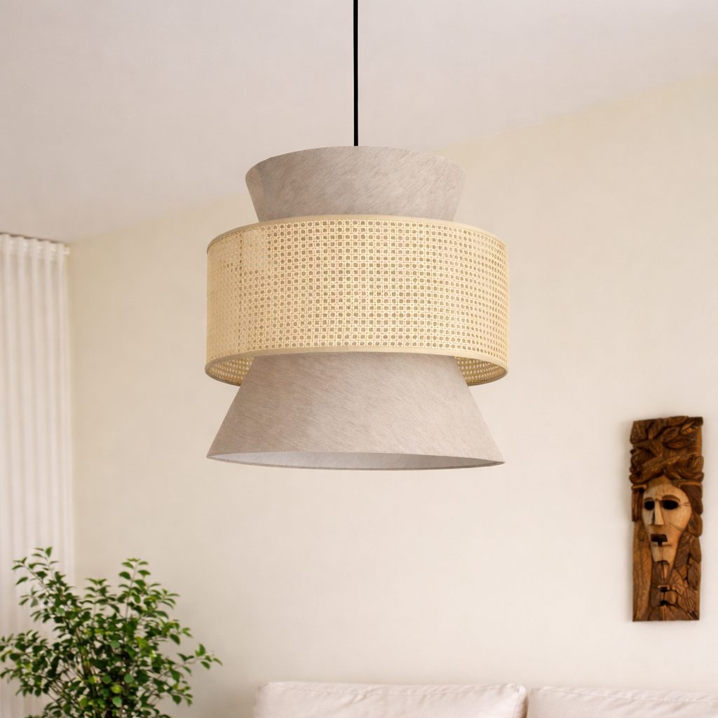 Lámpara colgante de estructura metálica con recubrimiento electrostática, con una capa mimbre natural y tela de lino