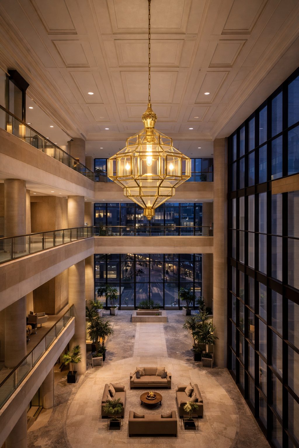 Este candil artesanal combina la resistencia y brillo del latón con la transparencia del cristal, creando un juego de luces sofisticado y cálido. Su diseño geométrico aporta un estilo contemporáneo con toques clásicos, ideal para realzar comedores, salas o recibidores con un ambiente distinguido.