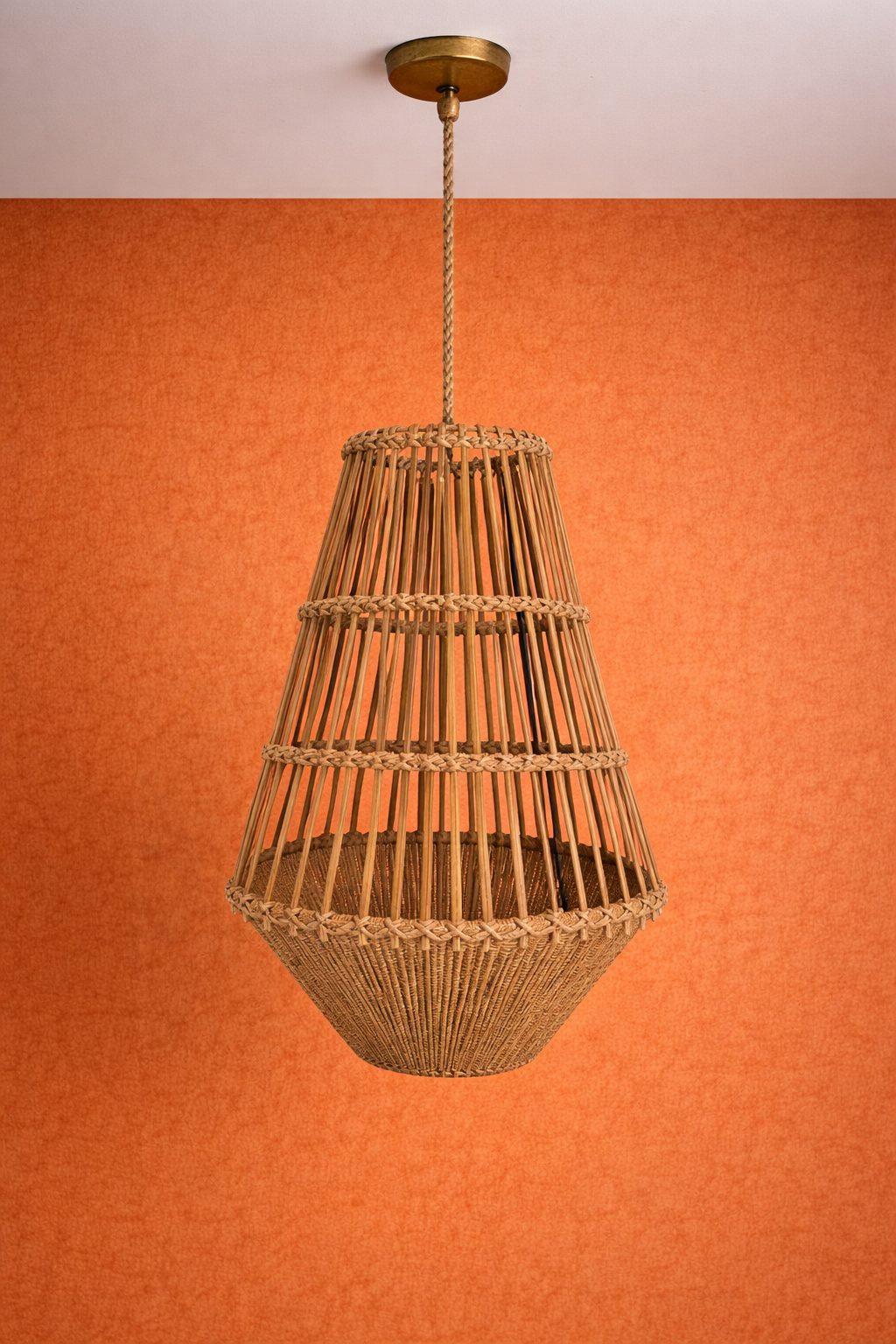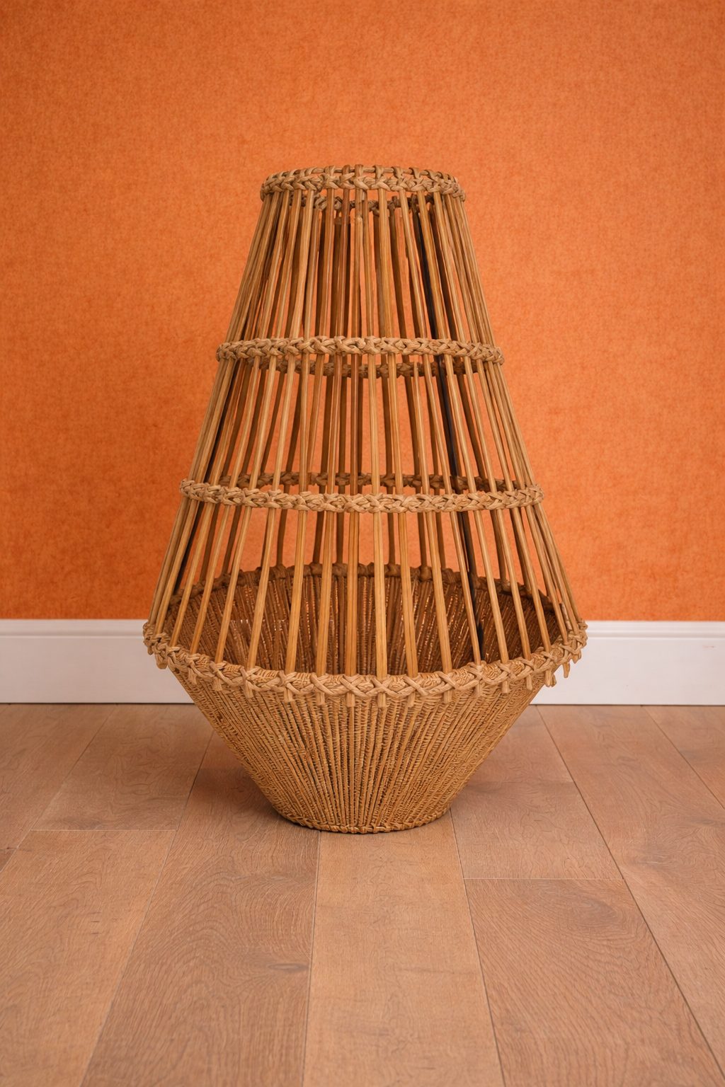 Lámpara con estructura metálica con recubrimiento electrostático. Con diámetro superior de 14cm y una altura de 46cm, tejidas a base de hilo de yute natural y de cuerda de cáñamo.