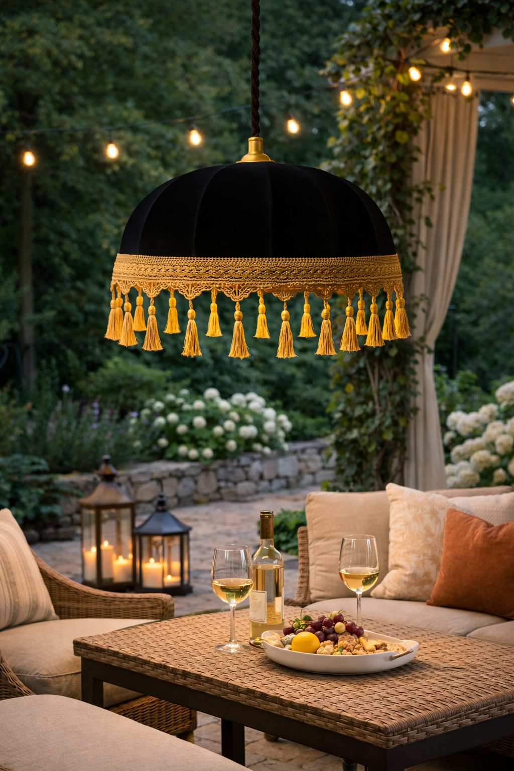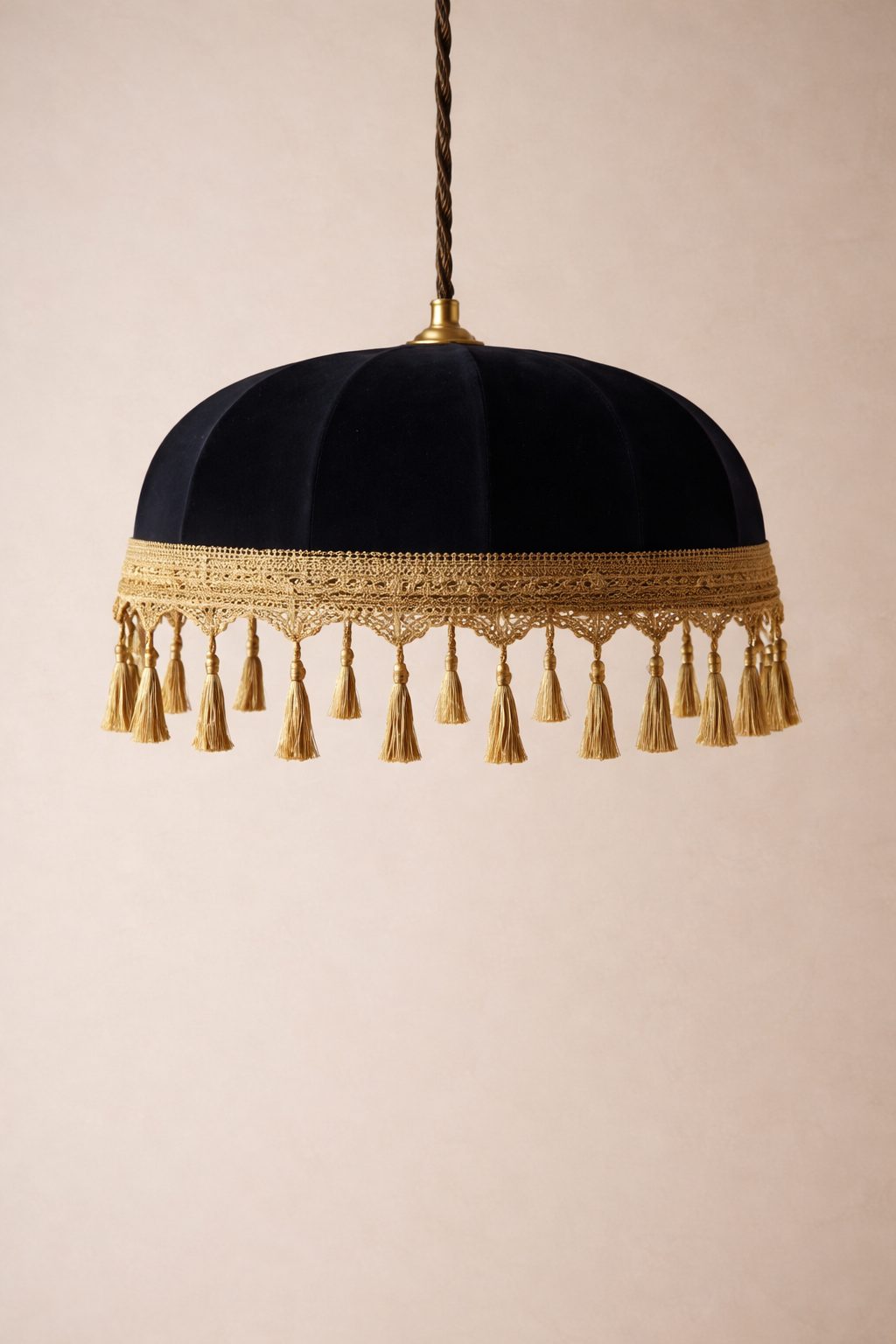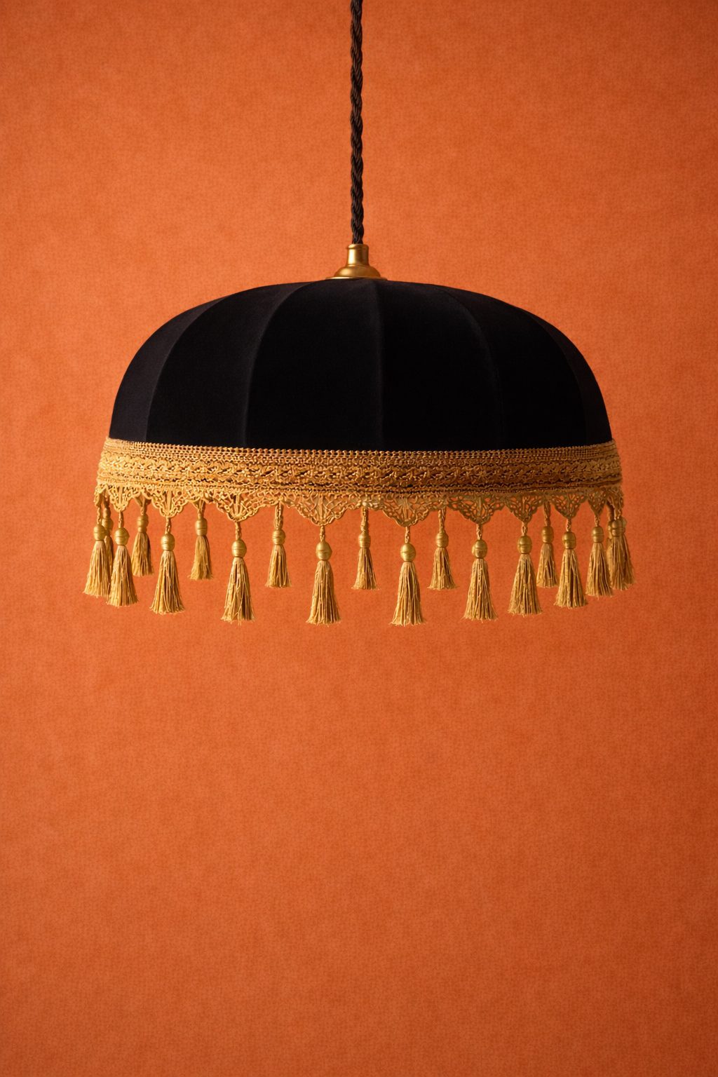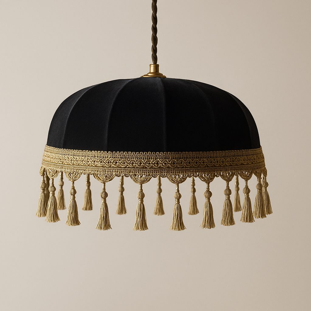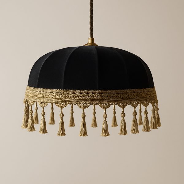 Lámpara colgante, fabricada a partir de una estructura metálica con recubrimiento electrostático, forrada con una cubierta de tela color negro, y fleco en color dorado.