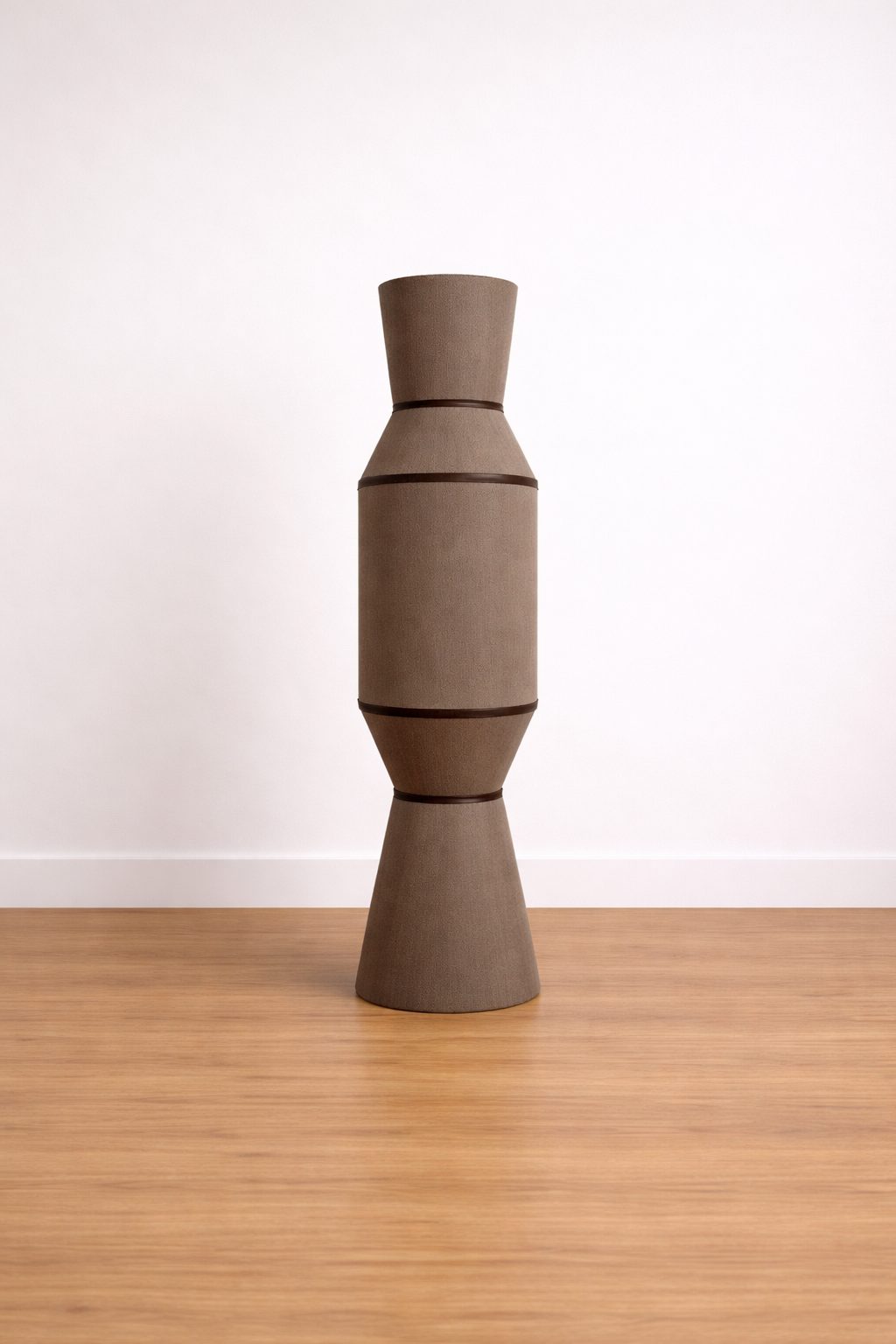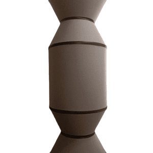 Lámpara colgante, estructura metálica, cubierta de tela color gris, con biees en tono negro.