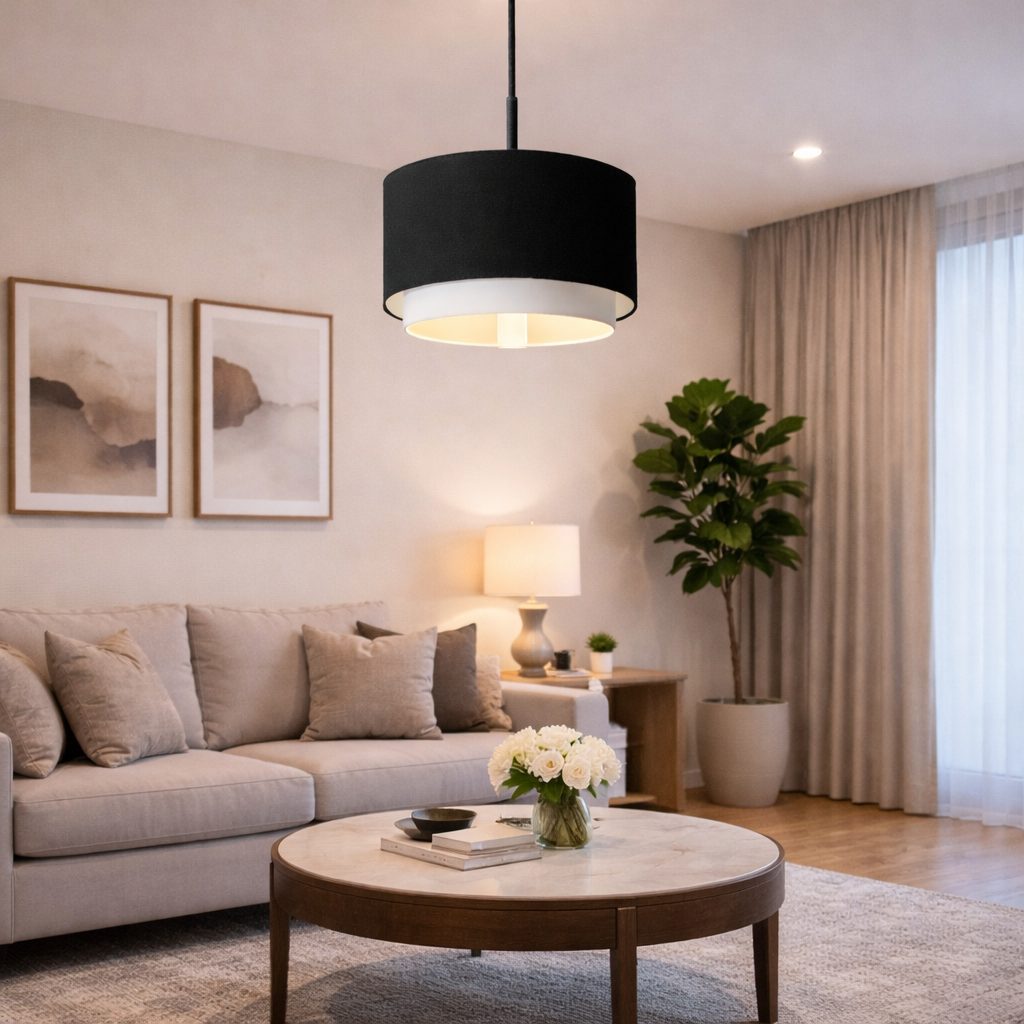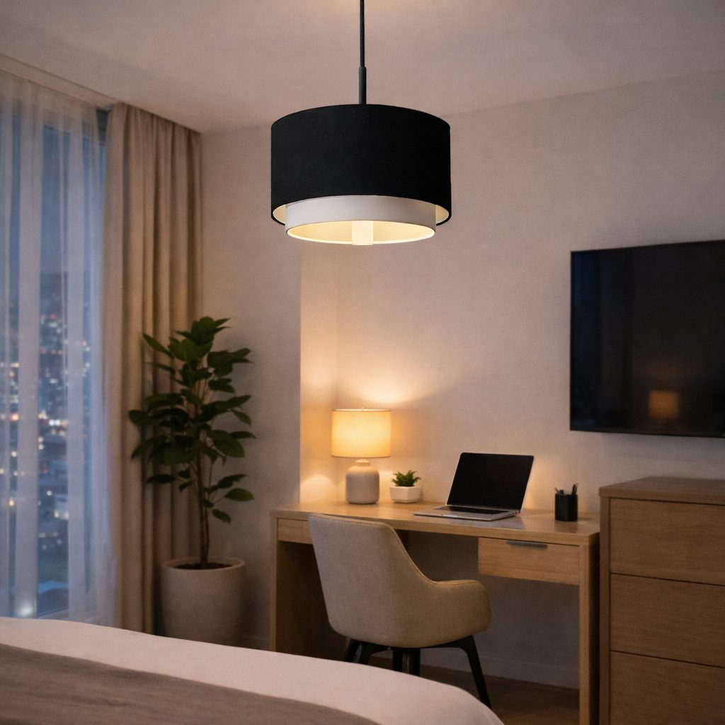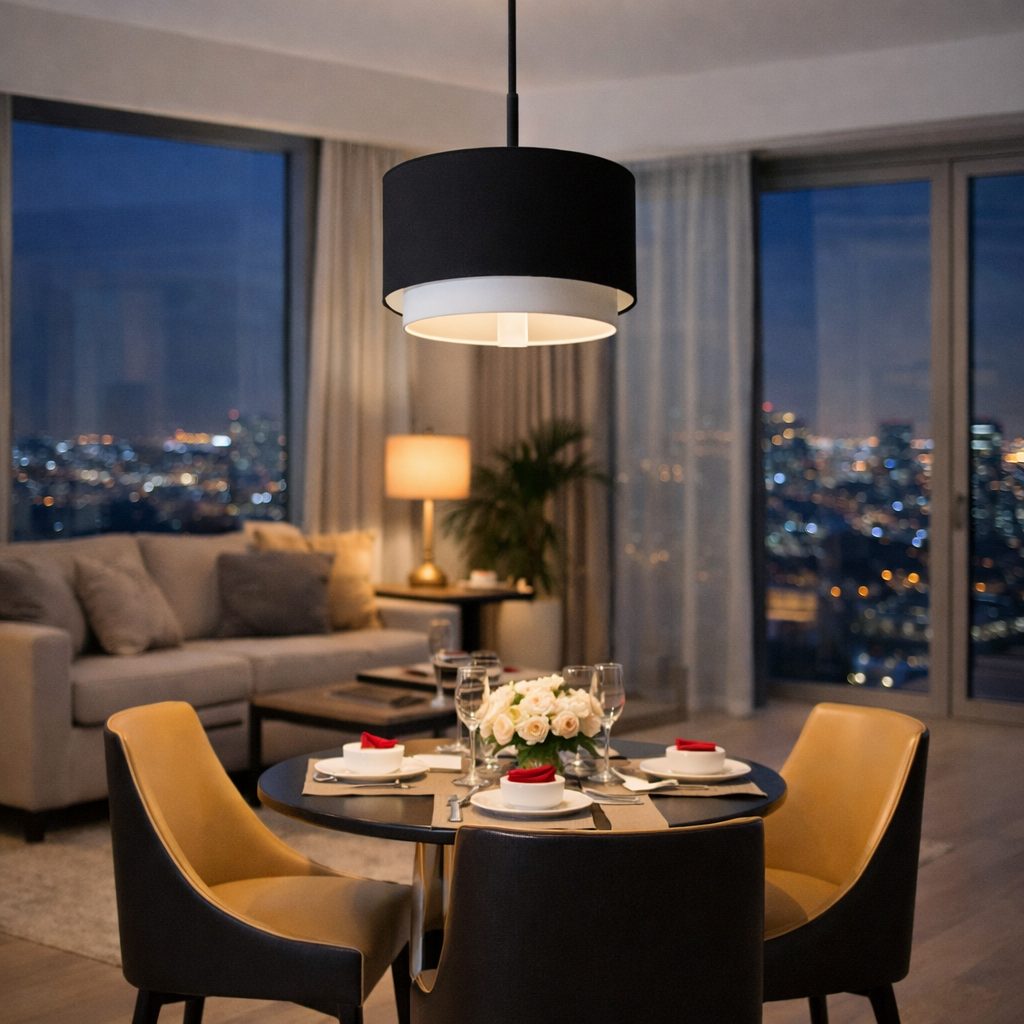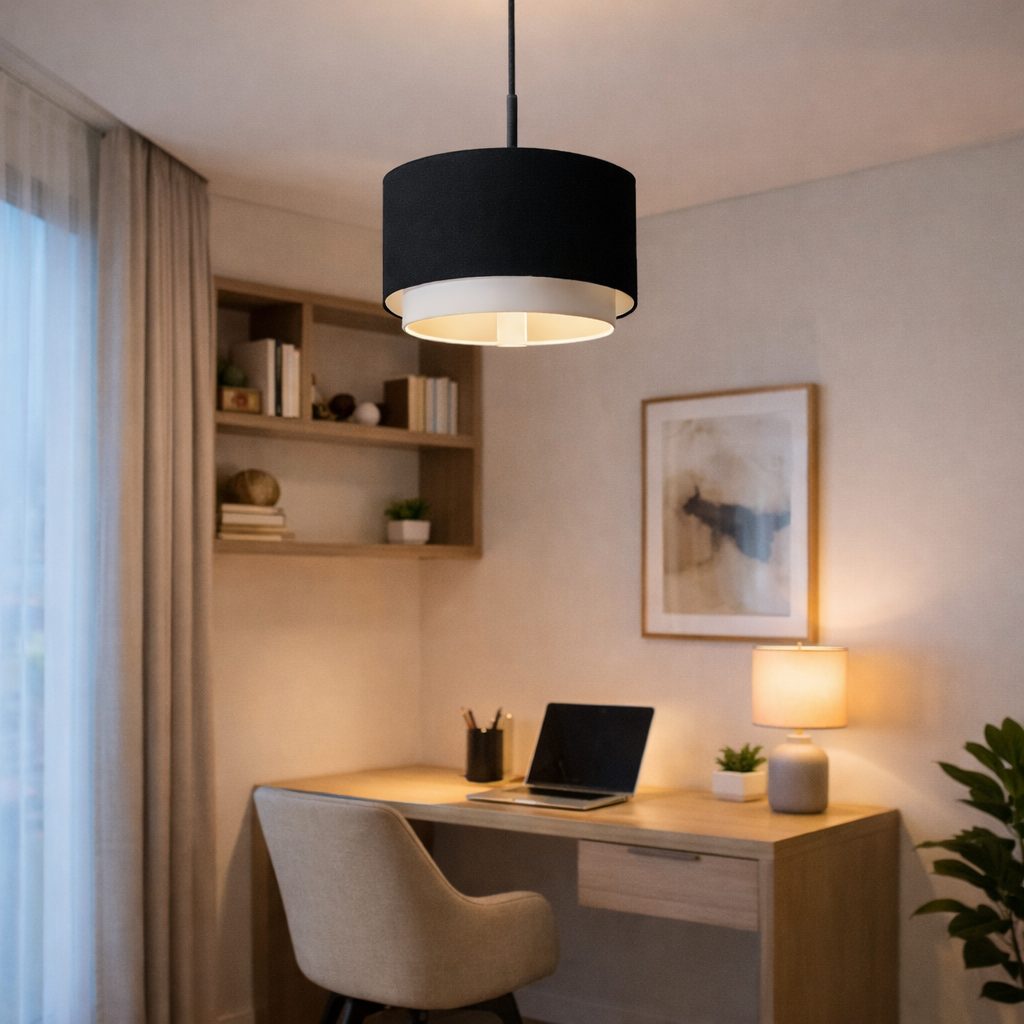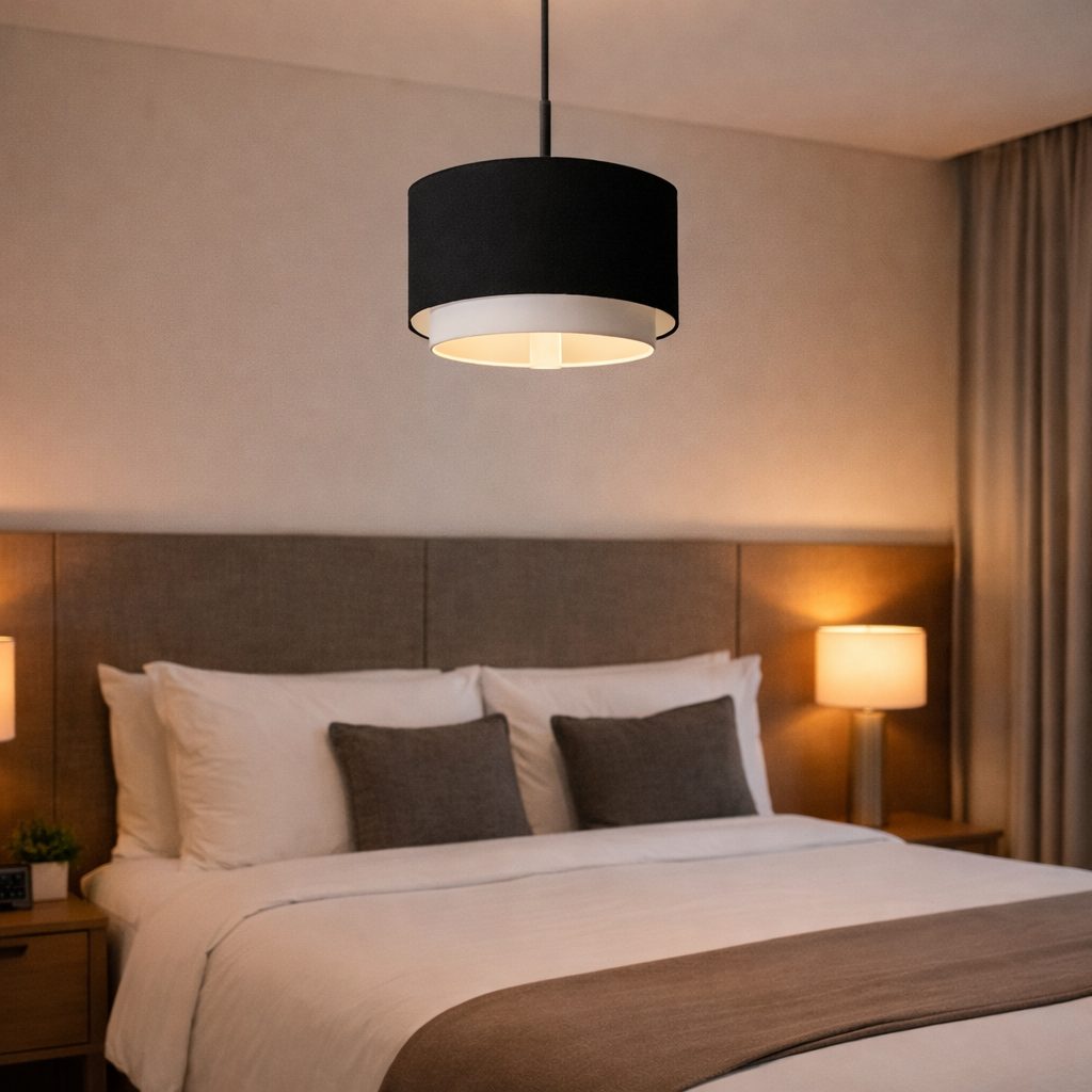Lámpara colgante estilo oriental con tela tinto y dorado en los bordes.