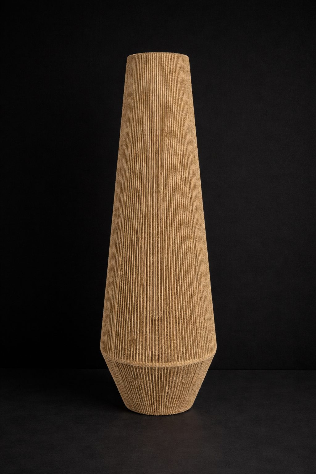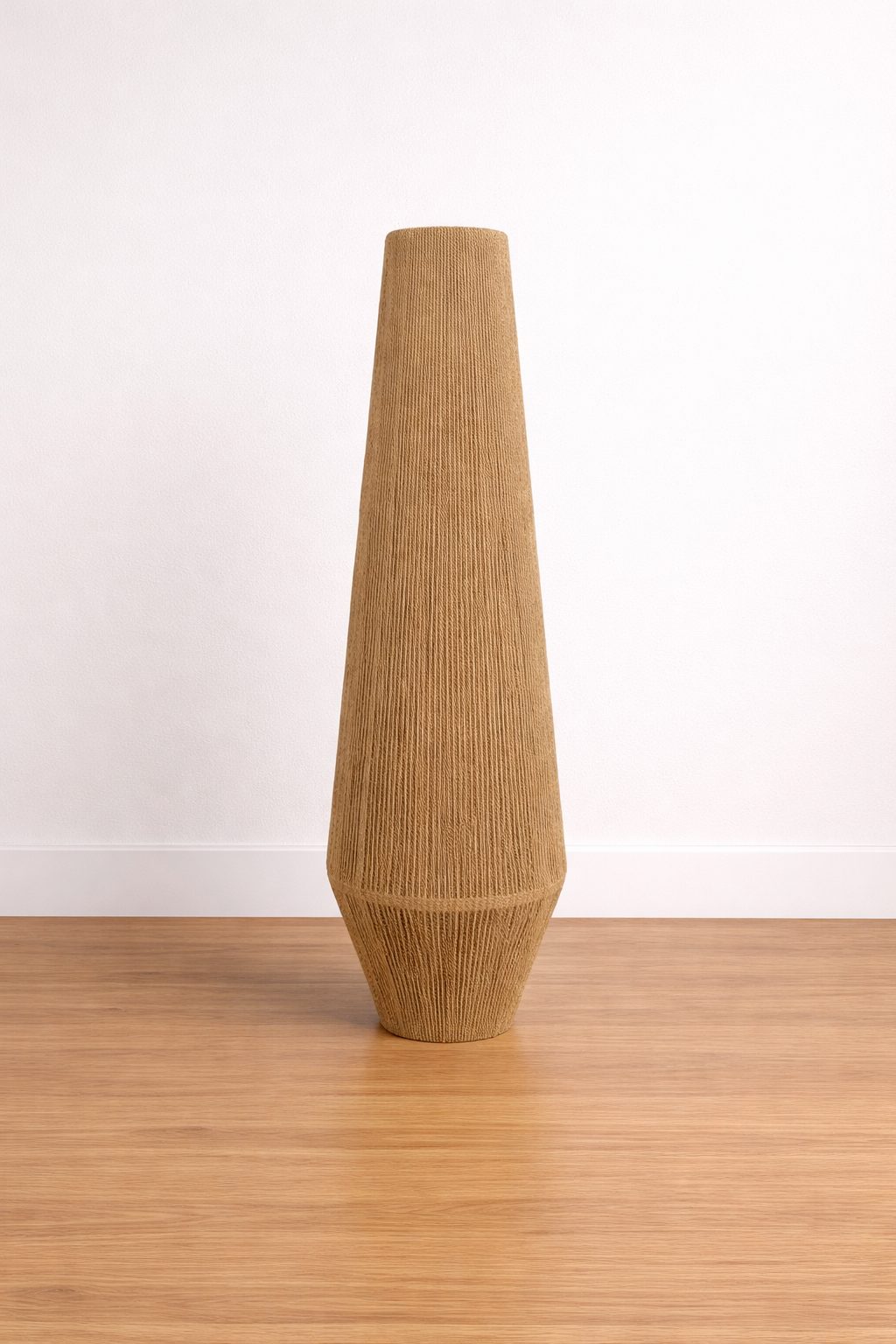 Lámpara en forma de rombo, con diametr0 superior de 14 cm, y una altura de 47cm, tejida a base de cordón trenzado.