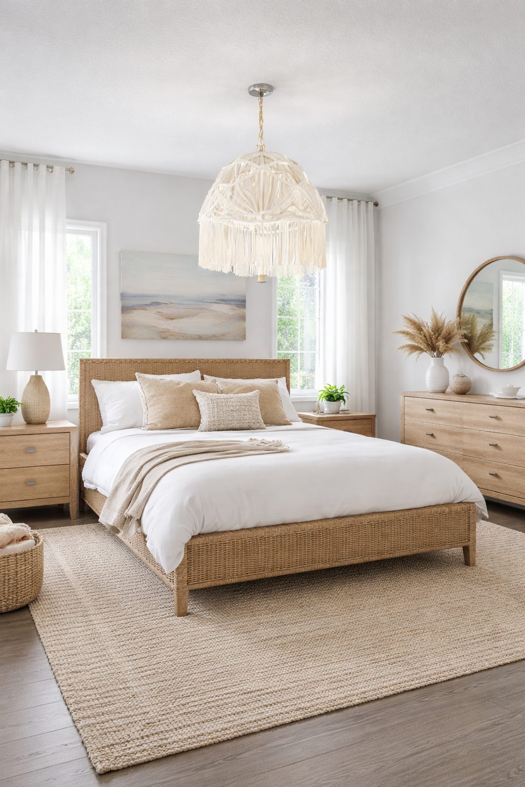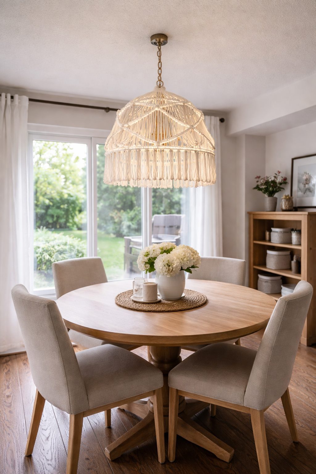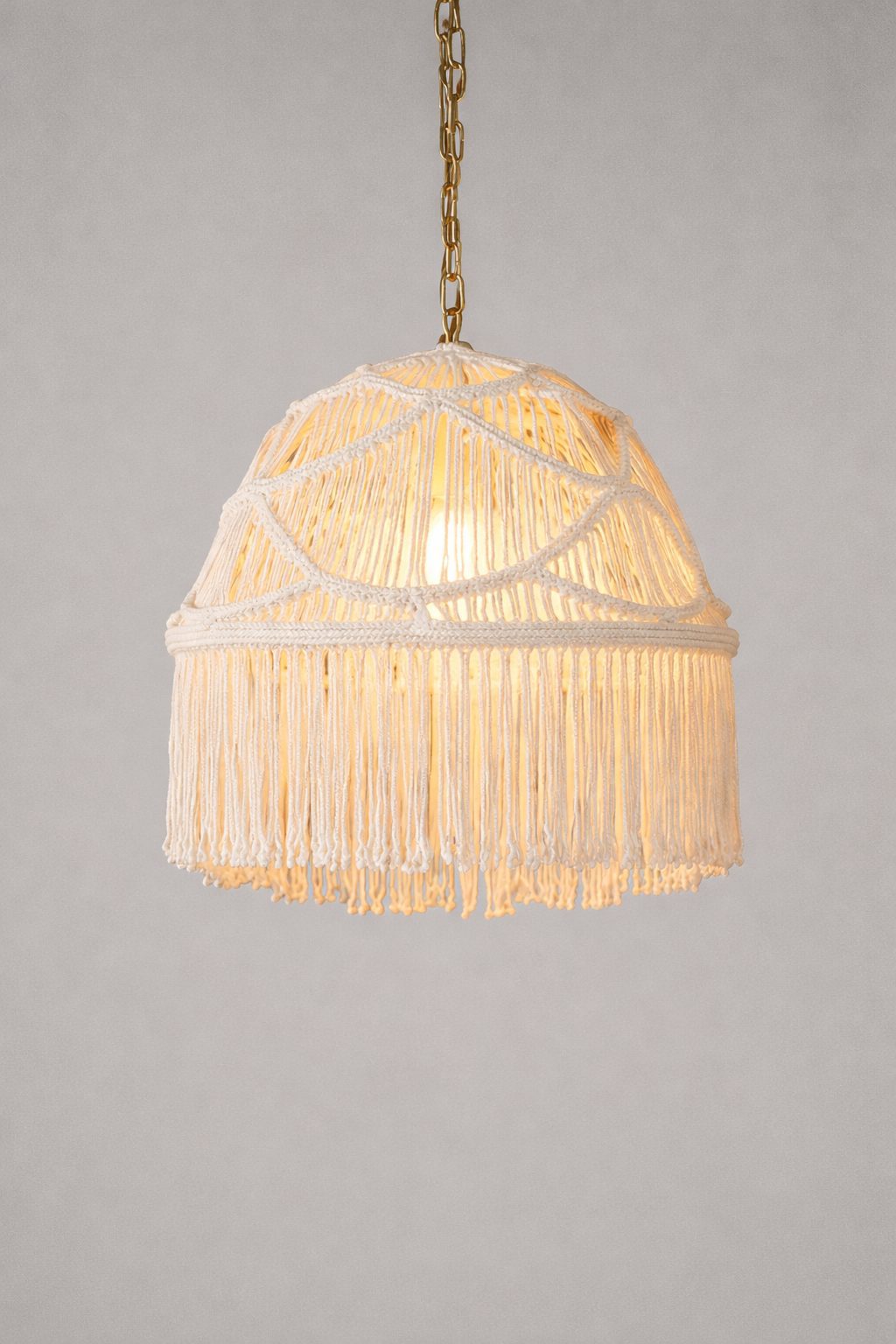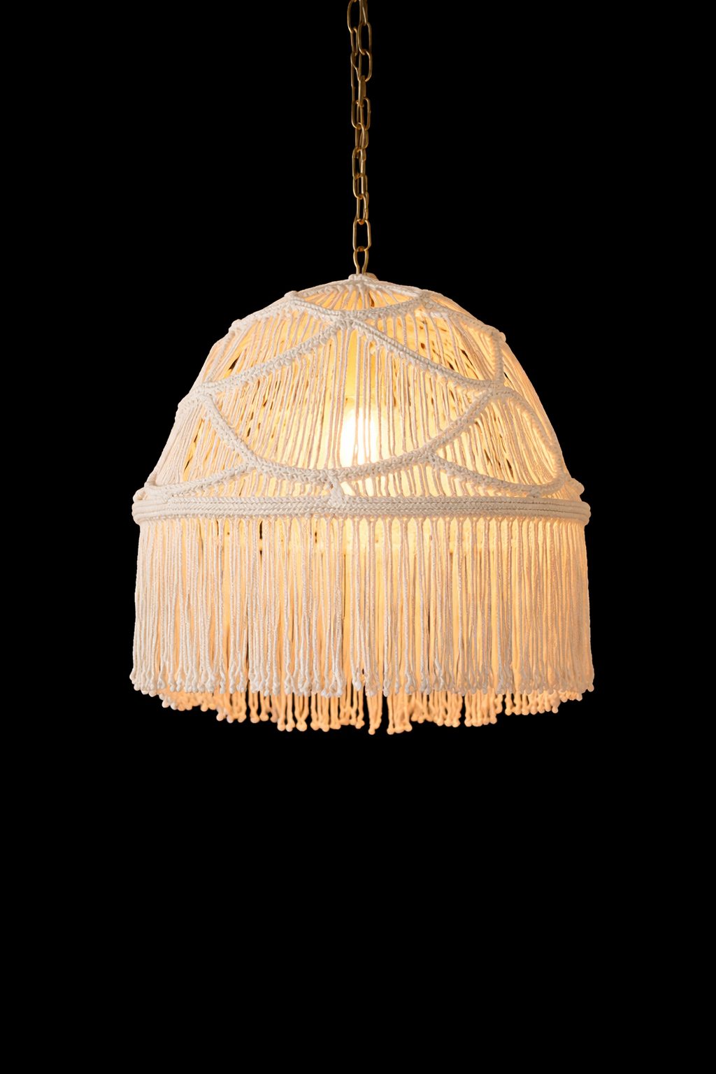 Lámpara colgante, estructura de metal con recubrimiento de macrame tejida a mano.