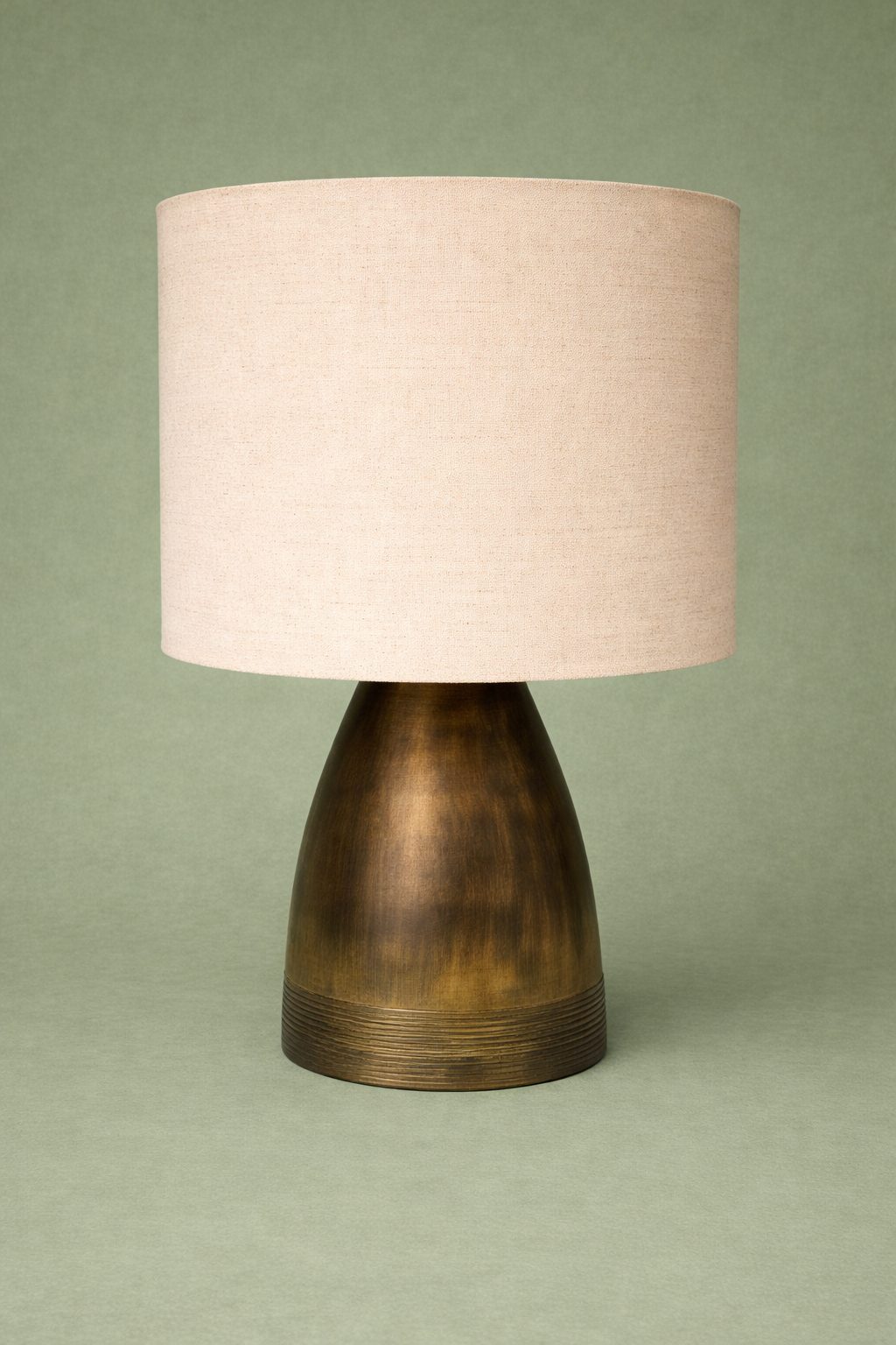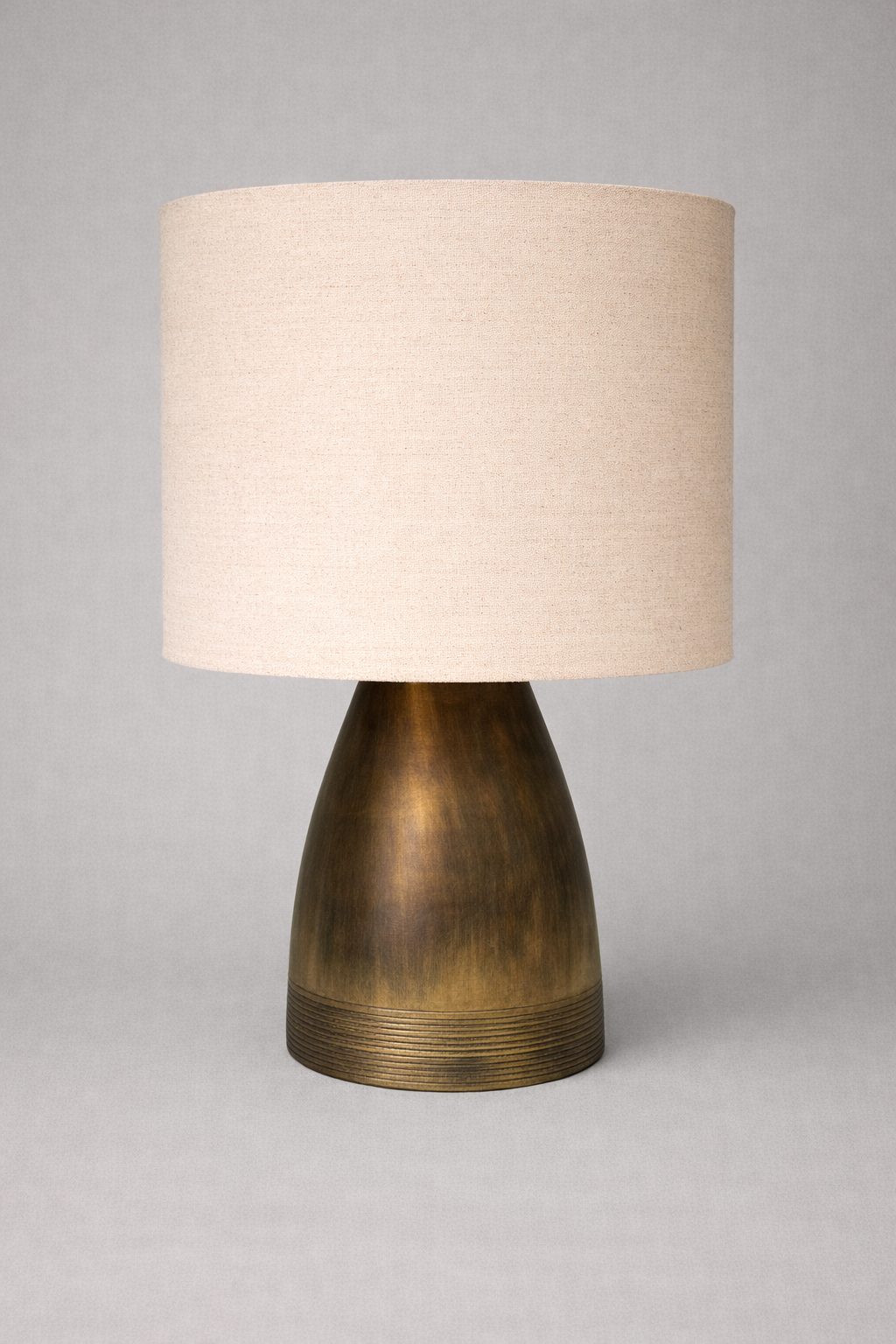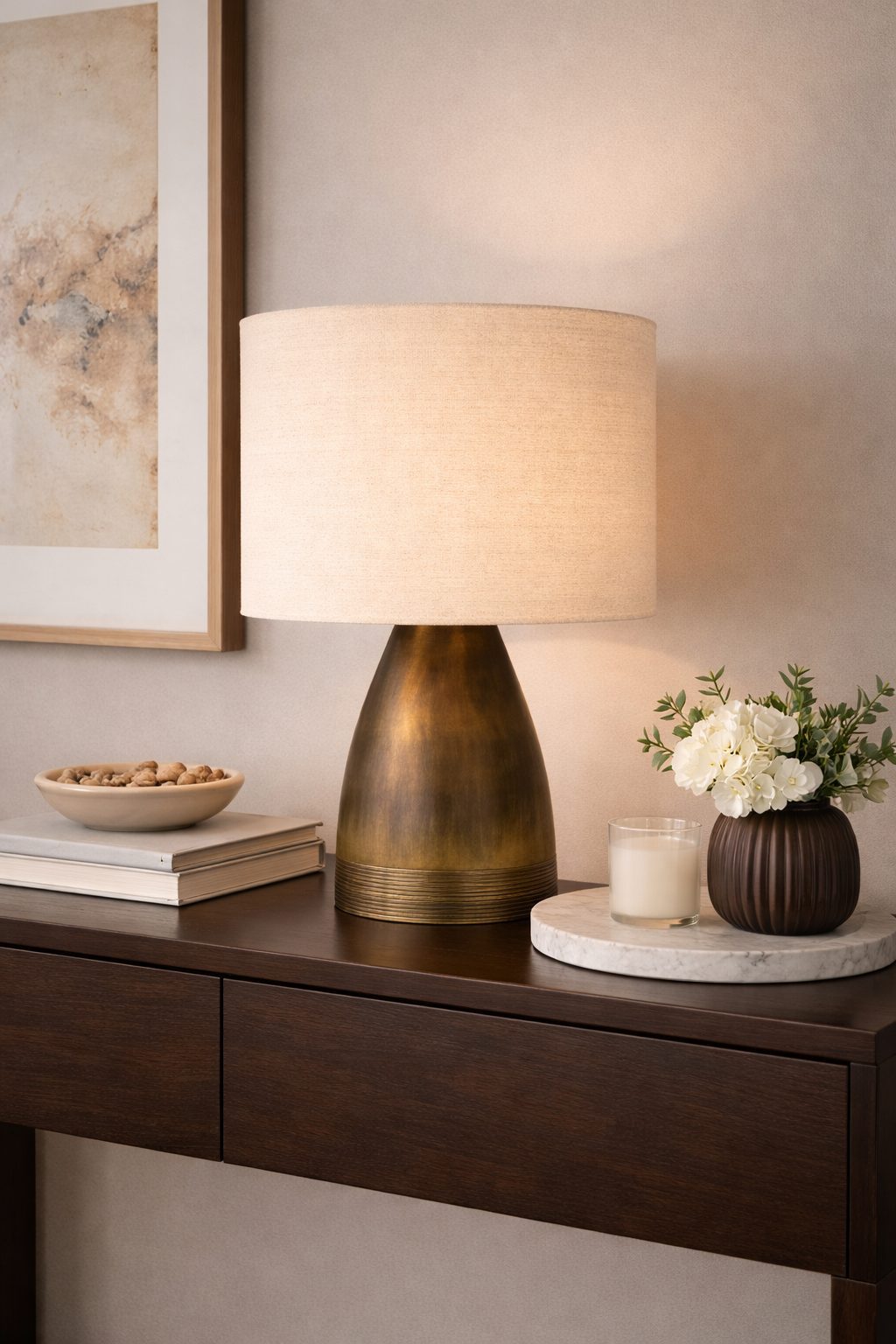 Lámpara de buró ,con una base de resina en color café y pantalla cilíndrica de 40cm de diámetro y 30cm de altura en color beige y tela de lino.