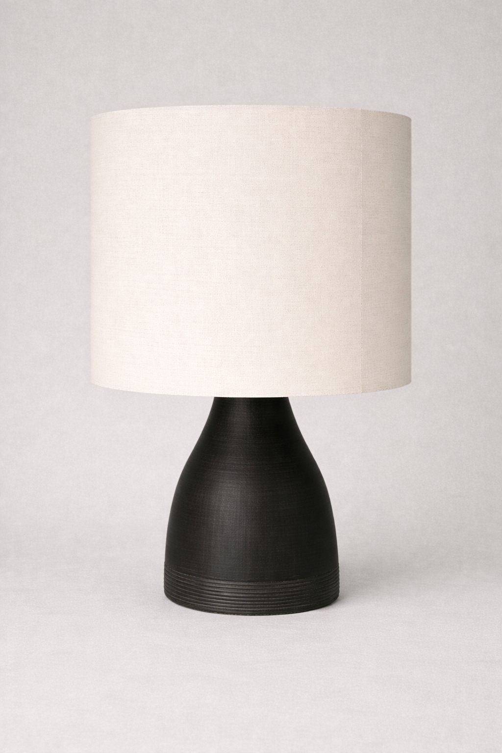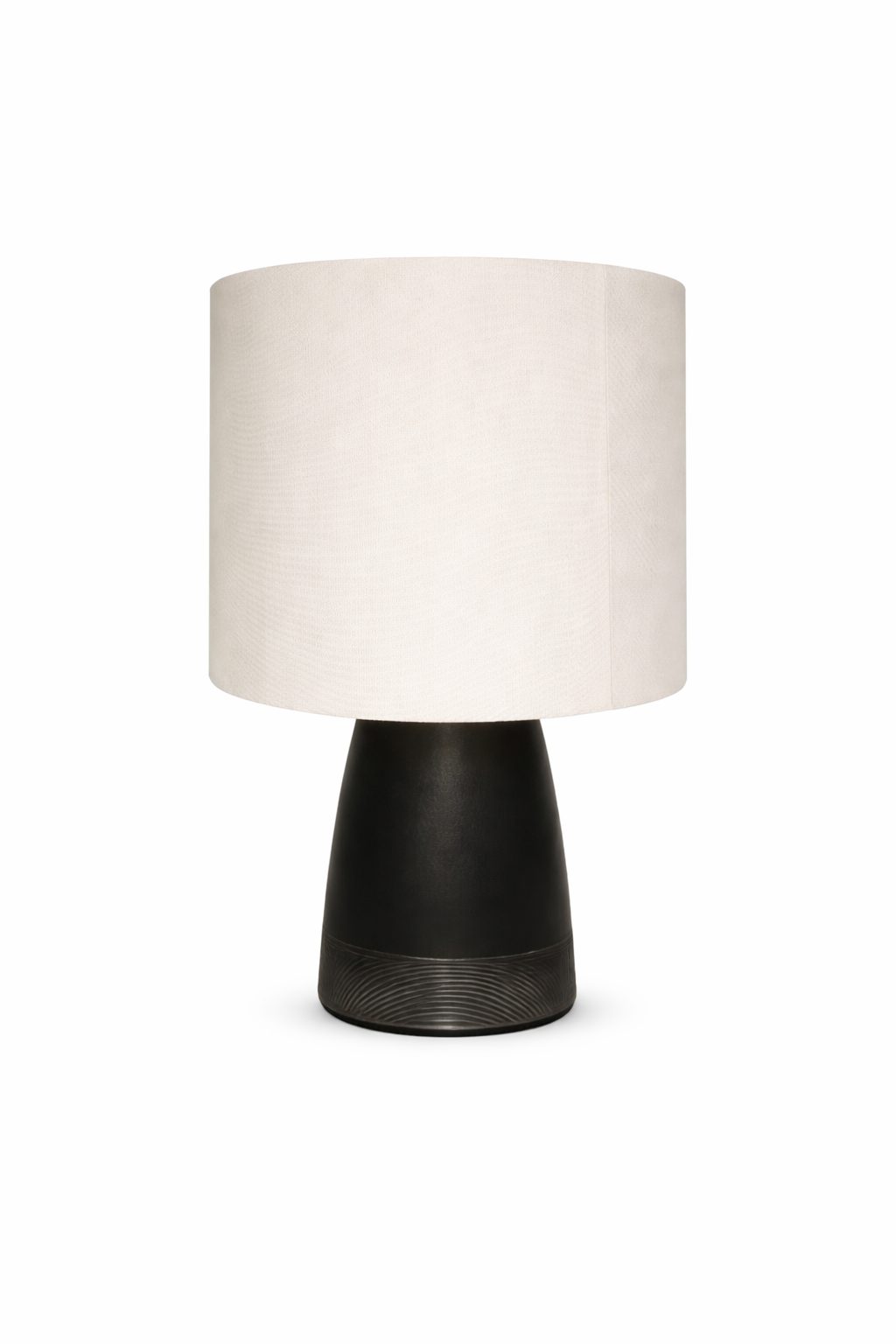 Lámpara de buró, con una base de resina en color negro y pantalla cilíndrica de 40cm de diámetro y una altura de 30cm color blanco.