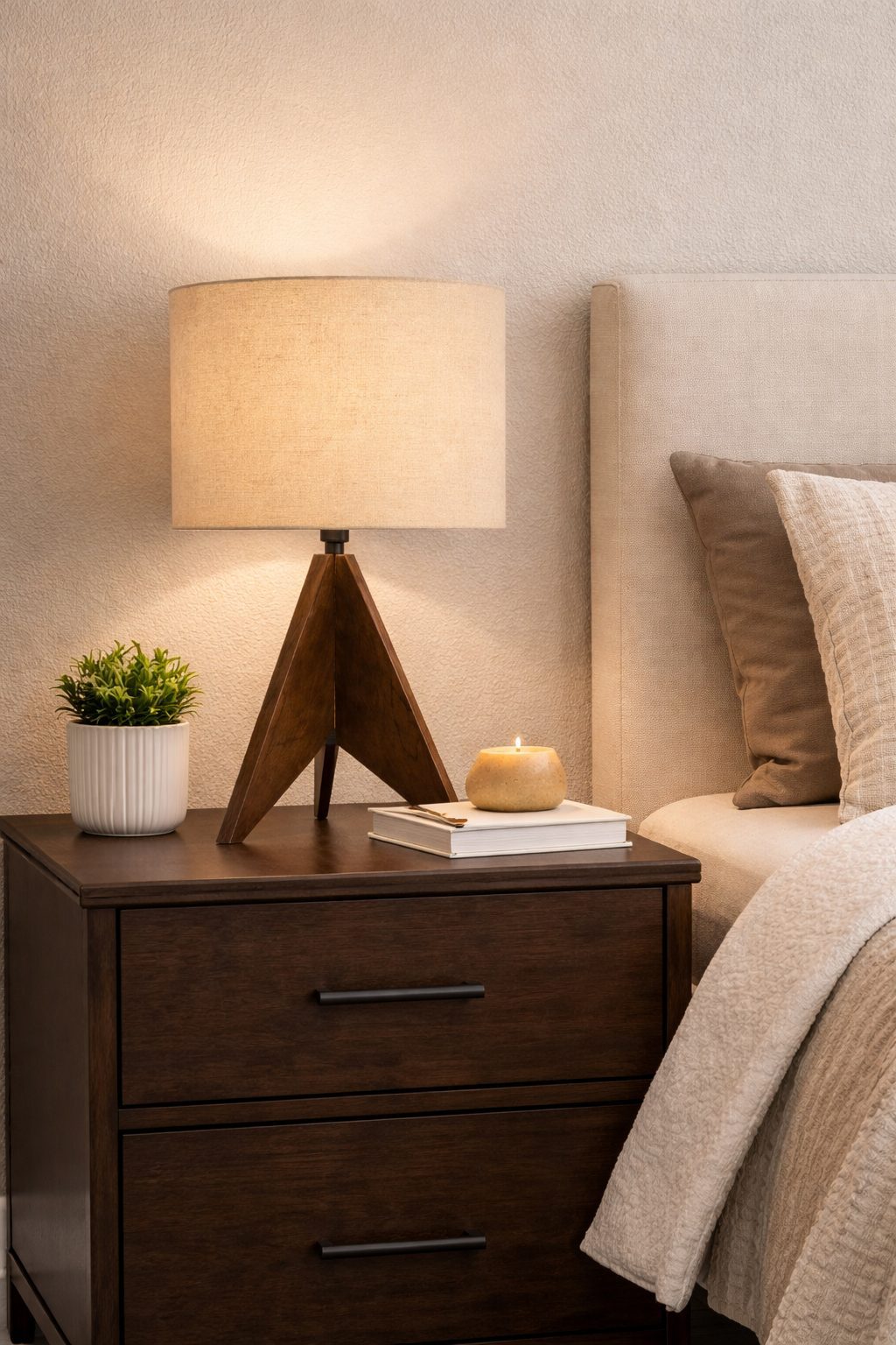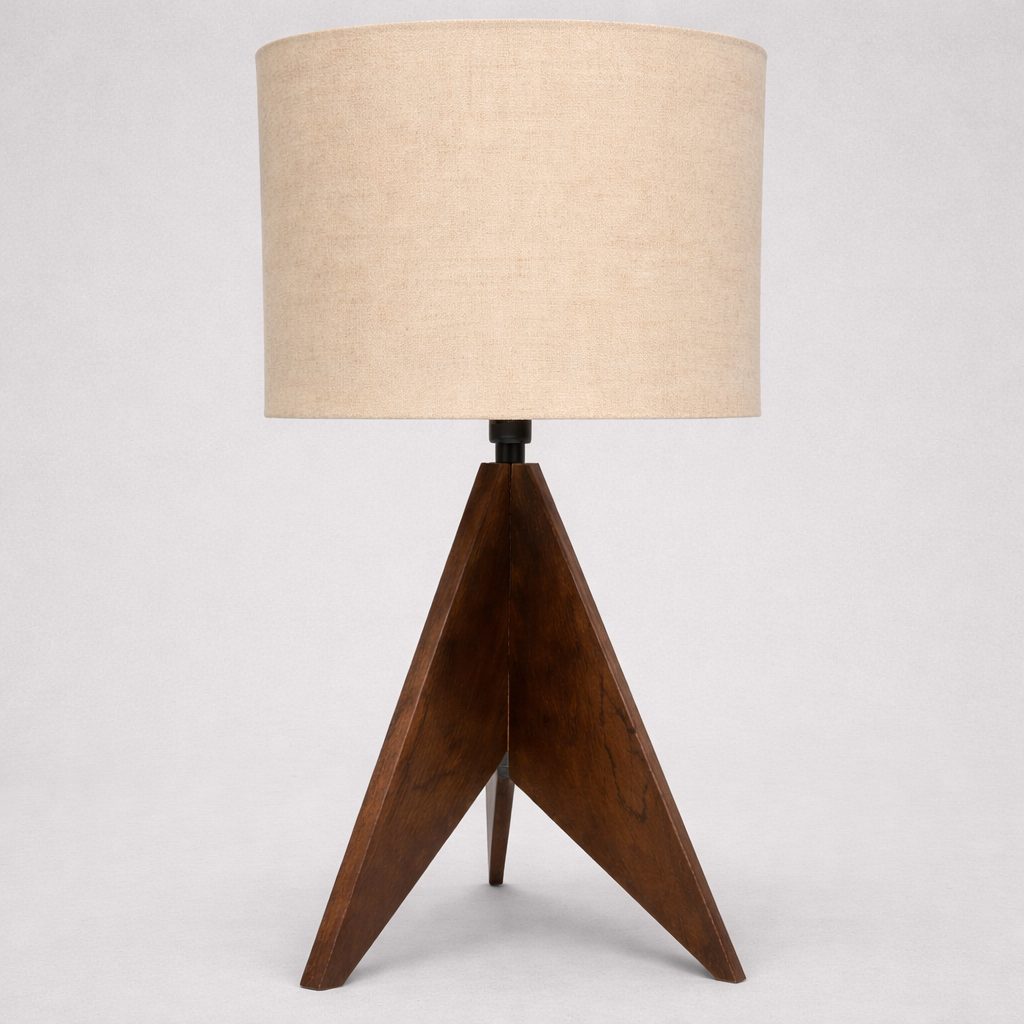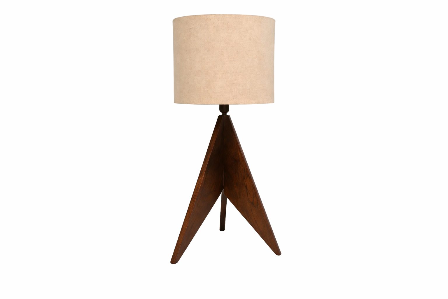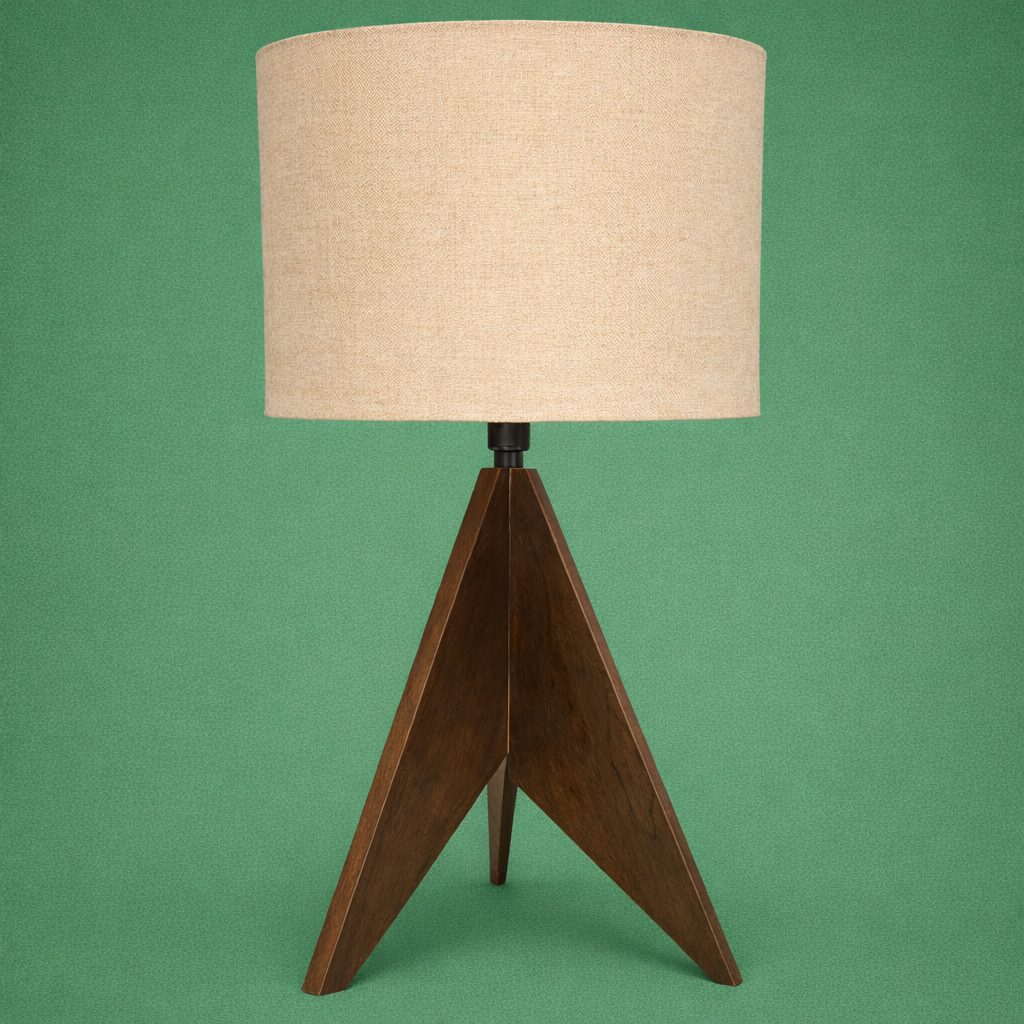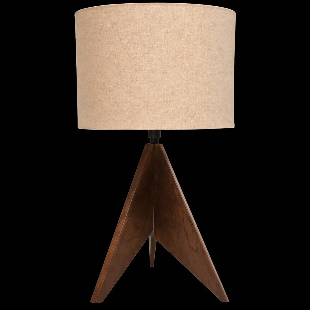 Lámpara de buró con base en forma de tripié de madera oscura y pantalla cilíndrica con 30cm de diámetro y 40cm de altura en color beige y tela de lino.
