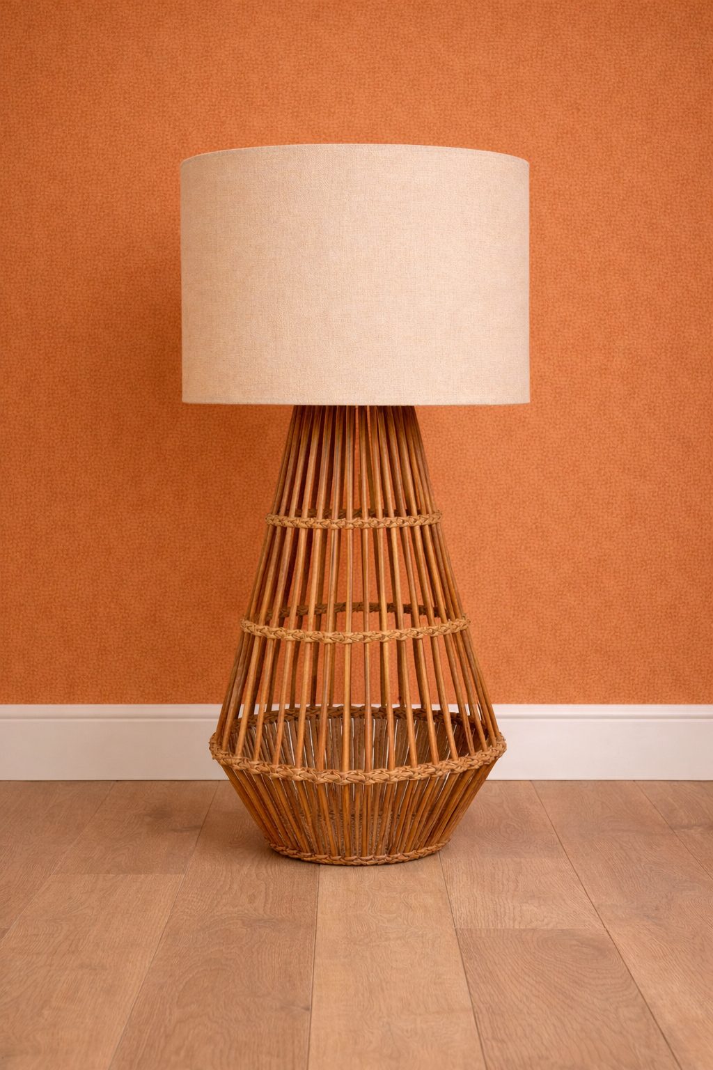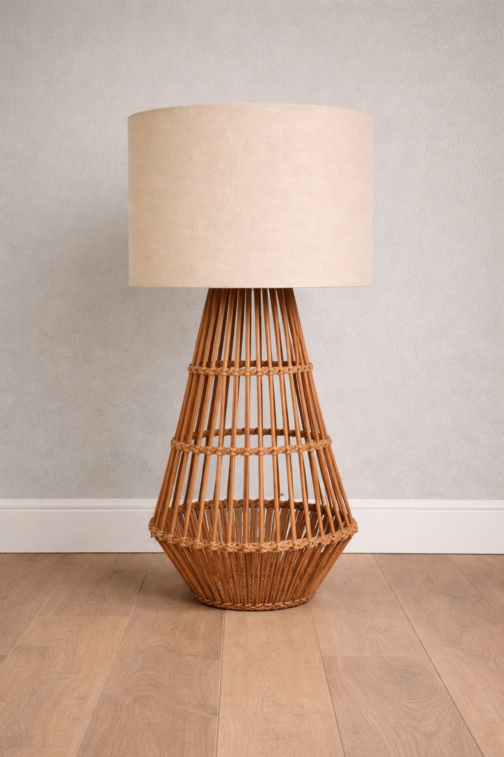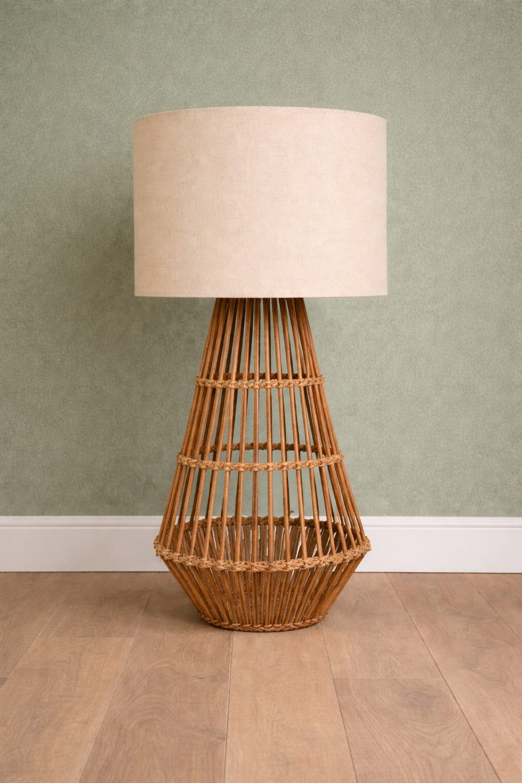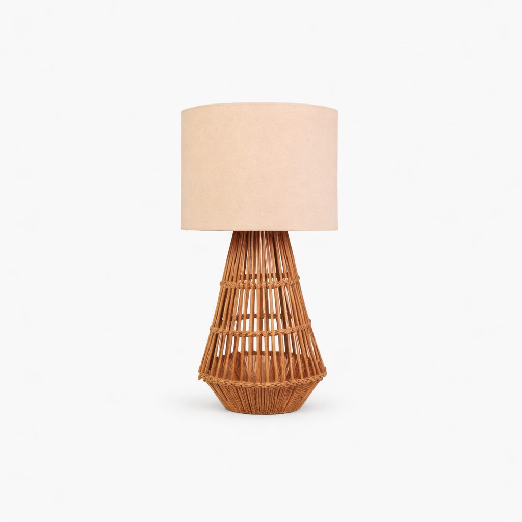 Lámpara elaborada en estructura metálica, con recubrimiento electrostático. Tejidas a base de hilo de yute natural y de cuerda de cáñamo, incluye pantalla cilíndrica en color beige y tela de lino.