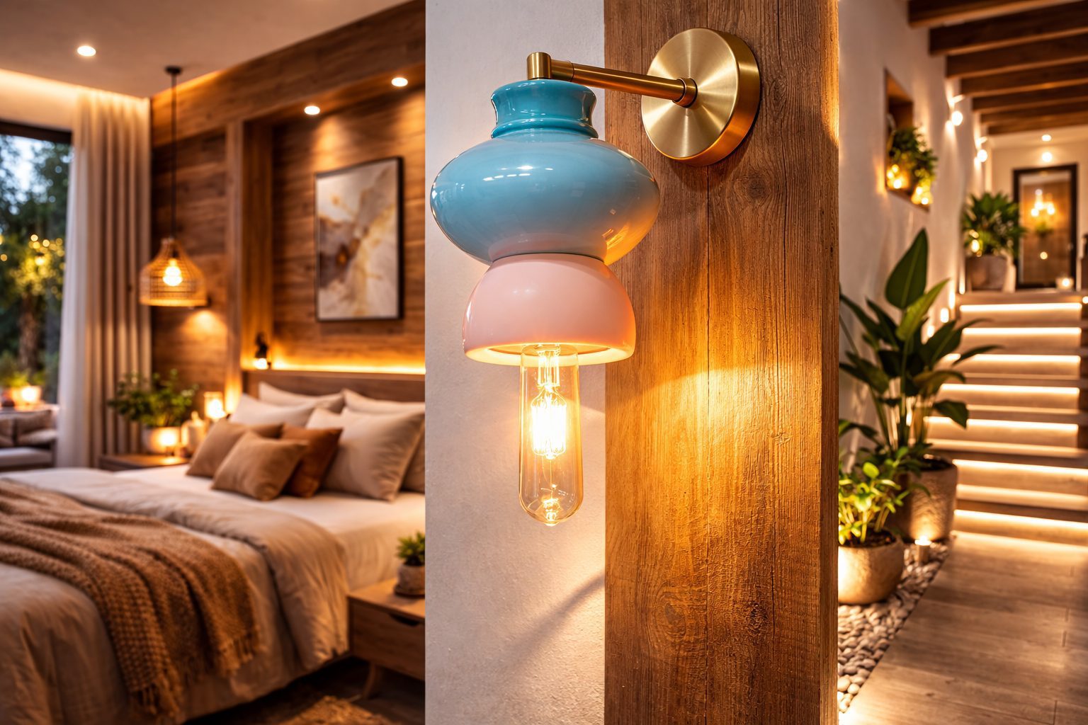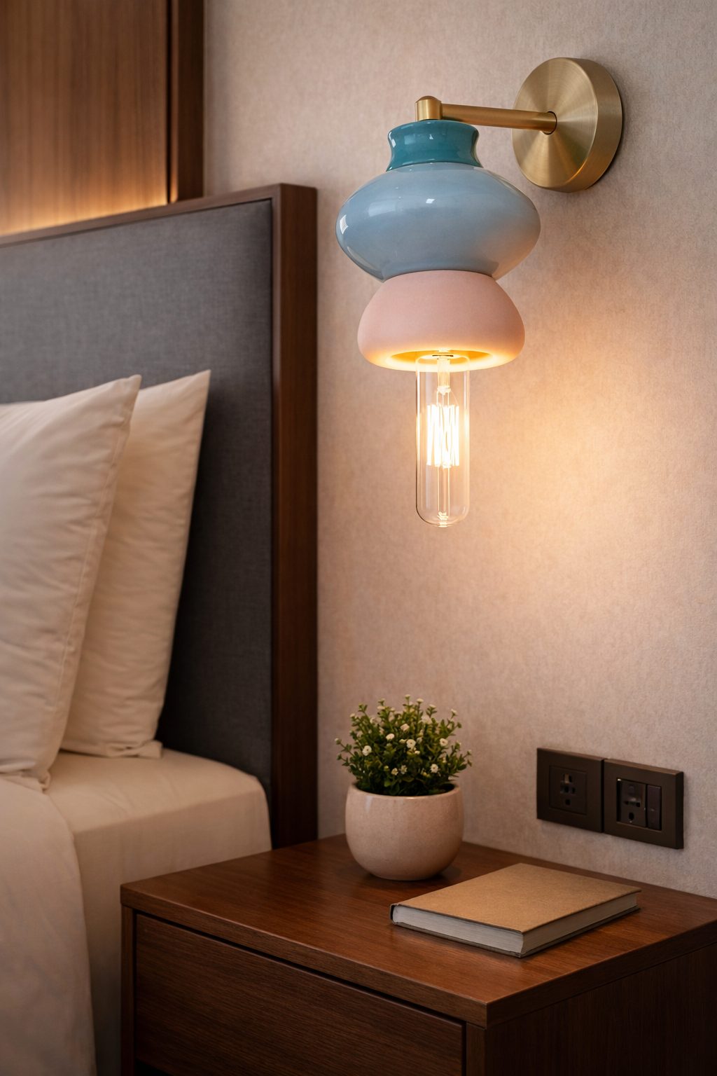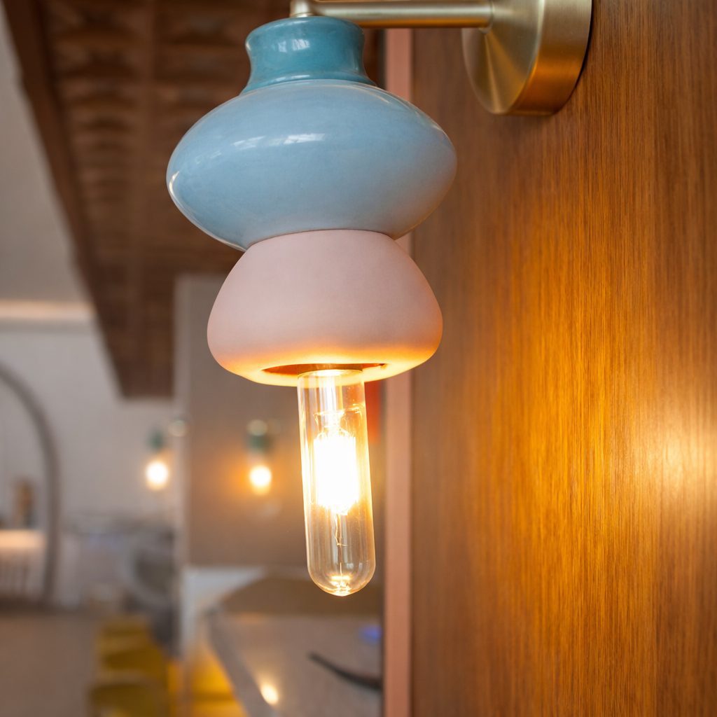 Hermosa lámpara arbotante, 22 cm de diámetro, accesorios dorados, con 3 módulos de cerámica bañados en esmalte de alto brillo.