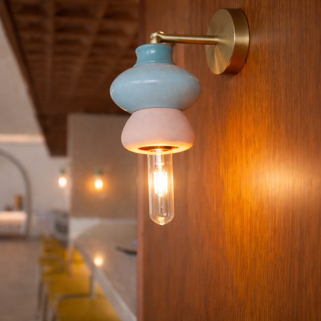 Hermosa lámpara arbotante, 22 cm de diámetro, accesorios dorados, con 3 módulos de cerámica bañados en esmalte de alto brillo.